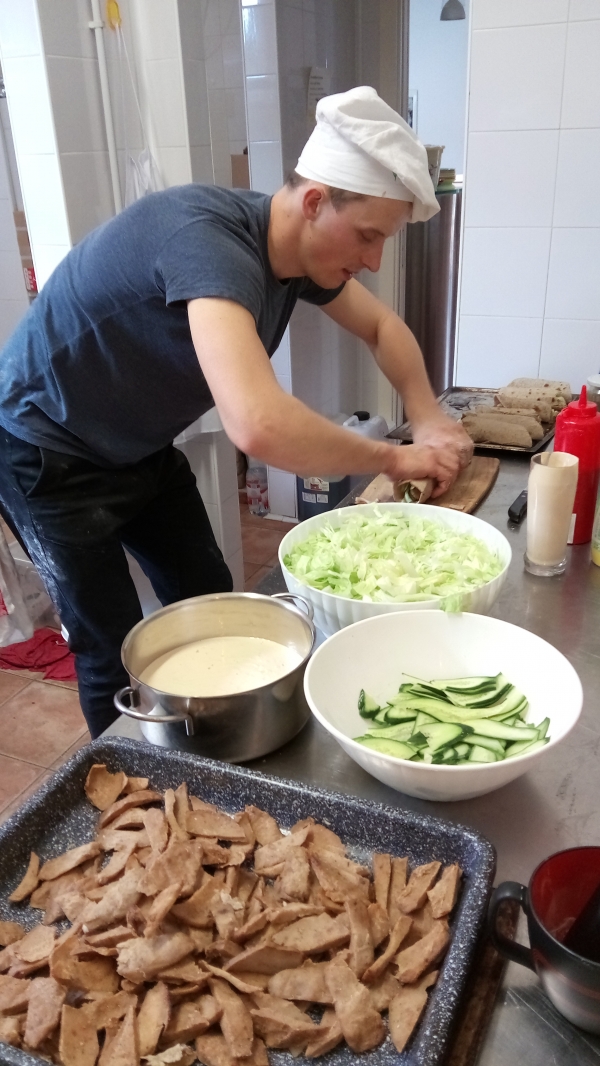 Během prvního turnusu jsme navařili všehovšudy více než 60 různých receptů. Učili jsme se v kuchyni jeden od druhého a každý ze sebe vydával maximum. Na nějaký michelinovský foodstyling nebyl čas, ale i tak si myslím, že jsme odvedli obrovský kus práce a připravili baštu, kterou by těm našim sportovcům mohl kdekdo závidět. A jak se zalizovali! Když si někteří chodili i třikrát přidat, věděli jsme, že nám s těmi pochvalami opravdu nevěší bulíky na nos a asi jim od nás vážně chutnalo. :) A když někdo některé suroviny nejedl? Stačilo říct a do půl hodiny jsme měli vyčarované alternativní menu. To se nám tak jeden den borec ozval, že nejí hřiby, které byly v rizotu. No co, ostatní pokračovali ve vaření a servírování zatímco já jsem se odpojila a šla připravit náhradní jídlo. Těžký freestyle a improvizace, na nějaké velké recepty nebyl čas. Nakonec se z toho vyklubala taková dobrota, že se zalizovala celá kuchyň. Druhý den jsme si tedy v kuchyni připravili pro sebe ten samý, lehce obměněný recept, že si dáme do nosu. Jenže v tom přišel ten samý borec, že nejí koprovku, takže řešení bylo okamžité. Rozdělili jsme se hezky po kamarádsku a pořádně si zadebužírovali. Ještě dneska mám tu lahodnou chuť grilovaných brambor s kitchen king masalou a křupavým salátem na jazyku. A brzy se snad objeví i mezi recepty na webu! :)
