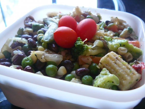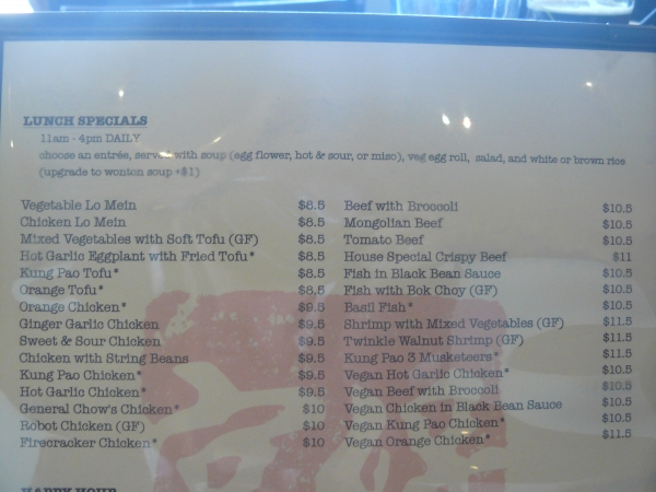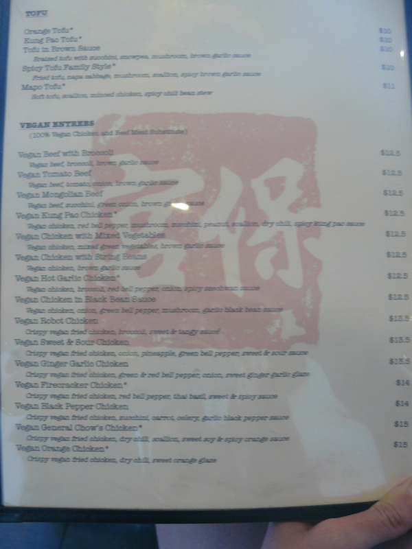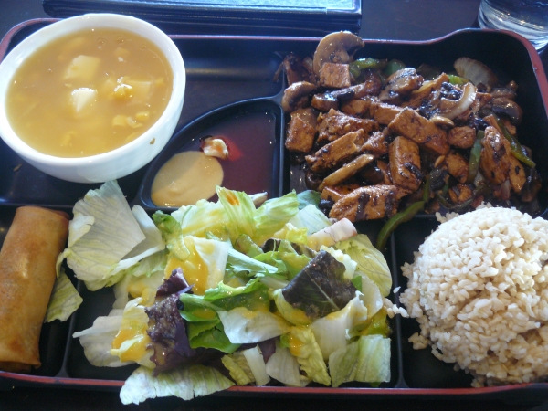 Obědové menu sestávalo z nevegan polévky, hlavního jídla, přílohy, salátu a vaječné rolky. Já si vyjednala čistě rostlinnou, kukuřičnou polévku s tofu kostkami (která však byla nic moc, bohužel) a veganský hlavní chod, ověřila rostlinný původ přílohy i všeho v salátu a nechala si donést i tu vaječnou rolku, kterou jsem nakonec věnovala tátovi, neb na mě byla ohromně mastná. Hlavní chod v podobě kuřecích nudliček v omáčce z černých fazolí s hnědou rýží a salát ale byli naprosto boží!!! Veganské kuřecí mě moc bavilo a na první ochutnání bylo poznat, že jde o opravdu kvalitní materiál, žádný obyčejný sojový plátek. Celkově bylo jídla tolik, že jsem si musela nechat část zabalit s sebou a tak jsem byla opět spokojená hned dvakrát. V Kung Pau je báječná obsluha, která mi odpověděla s úsměvem a ochotou na všechny mé dotazy (a že jich bylo) a ceny jsou zde taky velmi příznivé. Pokud tedy někdy zavítáte do LA, určitě se tu zastavte, tahle bašta rozhodně stojí za to a nají se zde opravdu každý.