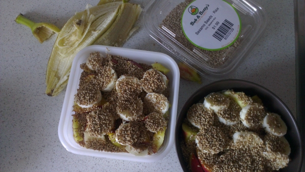Musela jsem uvažovat rychle. Popadla jsem proto velkou pixlu s jemnými ovesnými vločkami, trs banánů, pytlík rýže, pytlík čočky, cibuli, konzervu fazolí a rajčatové kousky ve vlastní šťávě dochucené bylinkami a kořením. K mému potěšení sestra přibrala i jablka a nějaké broskve a završily jsme to krabičkou sezamu.