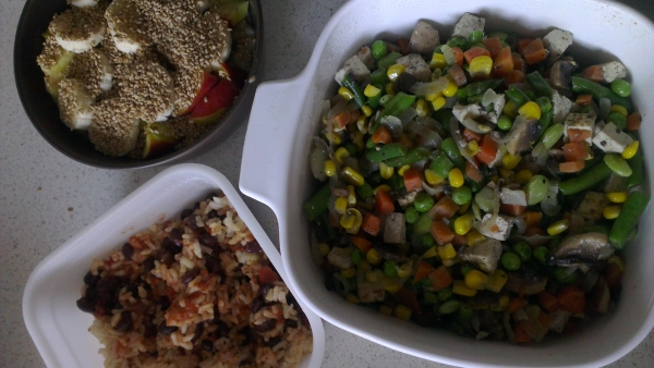 Každý den jsem proto měla na snídani ovesnou kaši s ovocem a sezamem, stejně tak s sebou do krabičky. První večer máma vařila pro ostatní špagety, tak jsem si z nich odebrala a dala si je s mexickými fazolemi, které mi zbyly i na druhý den. Balada. Další hlavní jídlo jsem vytvořila z rýže, restované cibulky, mražené zeleniny, trochy tofu, koření a žampionů. Smíchat dohromady a je to. Já tomuto jídlu říkám rizoto, i když vím, že to pravé, italské, vypadá naprosto jinak. Podobnou mňamku jsem si nachystala i poslední den. Zbyla mi trocha zeleninové směsi s žampiony, přidala jsem proto ještě další zeleninu, cizrnu z plechovky a bylo vymalováno. V batohu se mi každý den schovávaly i nějaké banány a jablka, kdyby na mě náhodou přišel nečekaný hlad.