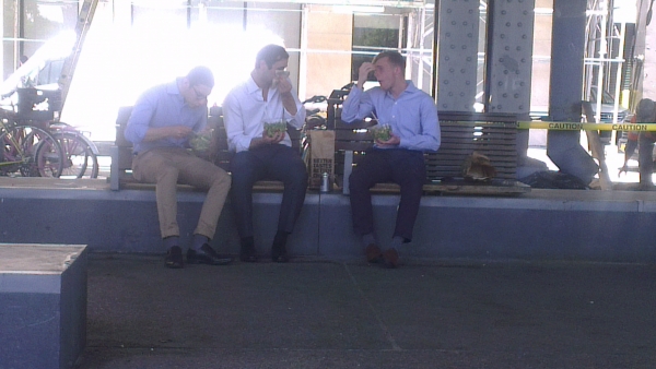 Všimla jsem si v podnicích jedné zajímavé věci - uvádějí u každého jídla jeho kalorickou hodnotu a někteří dokonce i obsah makroživin. Tyto informace bych rozhodně uvítala i u nás, člověk si alespoň uvědomí, kolik toho za den doopravdy spořádá. Začala jsem rovněž pozorovat lidi během obědové pauzy a zjistila, že spousta z nich si dává obědové zeleninové saláty. Když naproti mě v přístavu na lavičkách seděli tři mladí manažeři a evidentně s chutí si dopřávali kopec zeleně, musela jsem si je, samosebou těžce na tajňačku jako správný paparazzi, vyfotit. Pro mě nevídané. Hodně lidí si rovněž nosí jídlo do práce předpřipravené v krabičkách a obědvají na vzduchu různě po venku. Z vlastních zkušeností vím, že se takto dá ušetřit nemalý peníz, zejména tady v New Yorku.