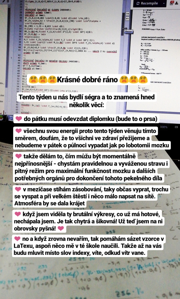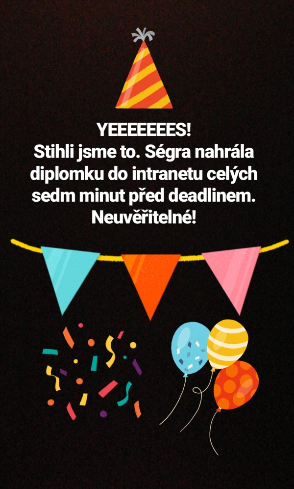 Dvatisíceosmnáctka u nás začla pěkně zostra. Jak jste už určitě četli v předchozím článku, byli jsme v solidním presu se ségřinou diplomkou. Do odevzdání její práce zbýval poslední týden, my ji opět adoptovali a prožívali celé ty peripetie s ní. 24/7. No co vám budu, atmosféra by se dala krájet a já jen tajně doufala, že z toho všichni vyvázneme bez větší újmy na zdraví, na těle i na duchu. Long story short, nakonec jsme to stihli. Bylo to drama do poslední minuty, ale celých krásných 7 minut před deadlinem svítila Aniččina diplomka v intranetu a my mohli jít konečně vypustit duše. Aleluja.