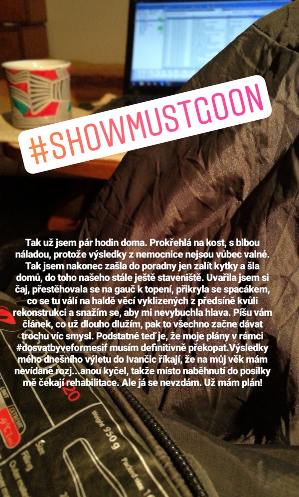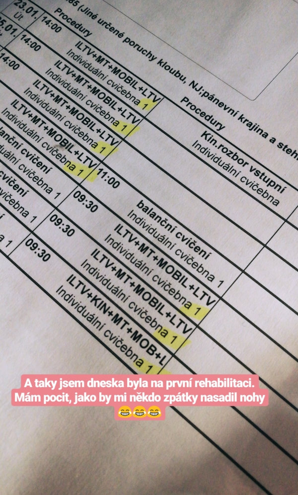 Čelní srážku s náklaďákem jsem nezažila, ale nějak takhle si představuju tu pecku. Byla jsem v šoku. Já, srdcem stále ještě atletka, co pořád někde lítá, běhá po kopcích a bez sportu je jak bez duše najednou bude řešit, jestli vůbec ujde pár kiláků bez bolesti? No bylo mi hrozně a nejhorší na tom bylo, že mě ty nohy fakt zatraceně moc bolely. Představa, že by se to ještě mělo zhoršovat, mě naprosto děsila. Do našeho polorozbořeného bytu jsem přišla totálně zničená, s rozpisem rehabilitací v ruce. To jediné mi dávalo naději. Už jen fakt, že jsem měla opět štěstí v neštěstí a zrovna se uvolnilo poslední místo na rehabkách, abych mohla začít okamžitě dávat dopořádku ty svoje poničené nohy, mi dával nějakou vnitřní víru, že se z toho zase vyhrabu. Musím!