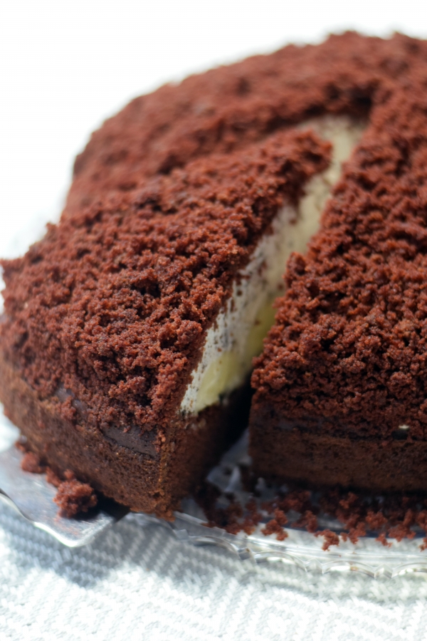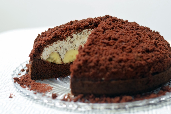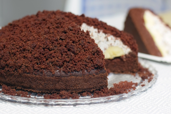 - Šlehačku/krém naneste na banány, vytvořte kopec a celou hroudu pak zasypte drobenkou z těsta, které vám zbylo při dlabání.