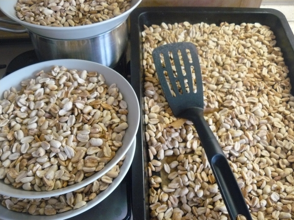 - Pokud máte arašídy nepražené, předehřejte troubu na 180 stupňů a dejte opéct na 10 minut. Občas promíchejte.