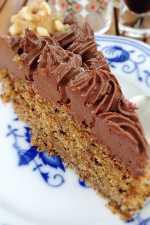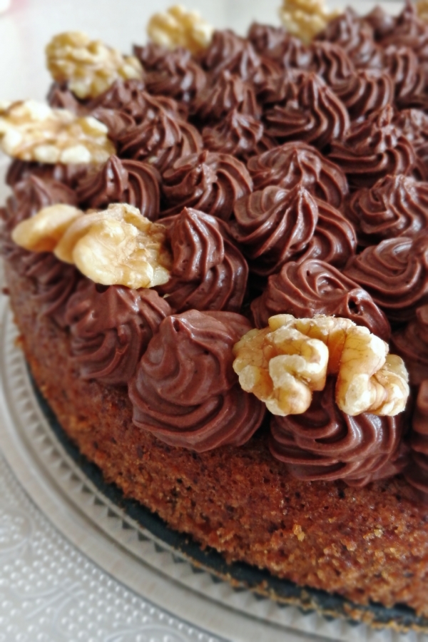 Původně Marina dort připravila spíše jako "bábovku" v kulaté formě politou čokoládovou ganache a zdobenou vlašskými ořechy, já ale tuto recepturu doplnila ještě o čokoládový krém, který znáte z receptu na čoko-čokoládový dort s malinovým rozvarem a musím říct, že to je skvělé kombo! Dort jsem chystala tátovi k narozkám, původně jsem chtěla korpus rozkrojit na dva a krémem naplnit, nicméně těsto je tak těžké a hutné, že jsem měla strach, aby se mi to celé nerozpadlo v rukách. Opět trochu improshow a z ní se vyklubala tato ustálená verze. Zkus ji taky!