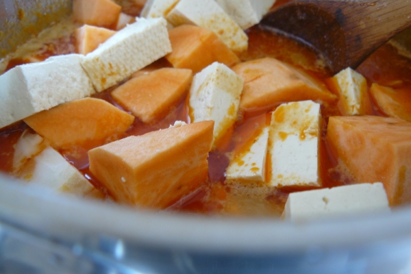 - Přidejte vývar, sůl, cukr, tamarindovou omáčku, očištěné sladké brambory a jicamu pokrájené na kostičky, tofu rovněž na kostky a za občasného míchání vařte 10 minut pod pokličkou.