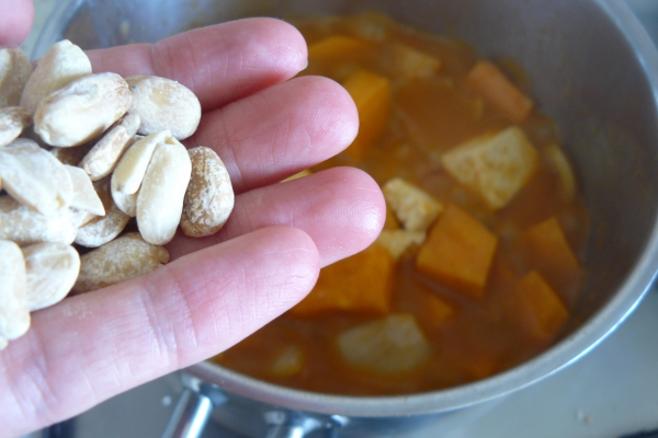 - Poté přidejte pražené nesolené arašídy a ještě cca 5 minut vařte za stálého míchání, abyste středně husté curry nepřipálili.