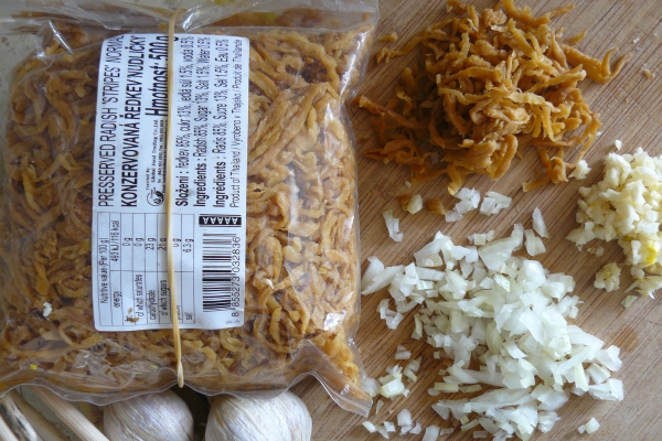 - Thajskou šalotku nebo cibuli a také česnek nasekejte najemno, pokrájejte půlku chilli papričky. Toto vše i s nakládanými nudličkami ředkve připravte na jedno místo (talíř, prkénko, miska).
