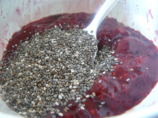 - V mezičase rozmixujte lesní ovoce, přidejte lžíci chia semínek a nechte 5-10 minut bobtnat. Vytvoří se hustá "marmeláda".