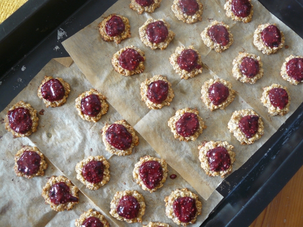 - Marmeládu umístěte do důlku v každé sušence a dejte ještě na chvíli zapéct do trouby.