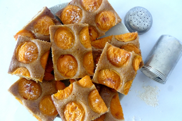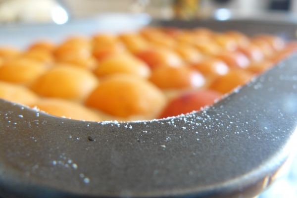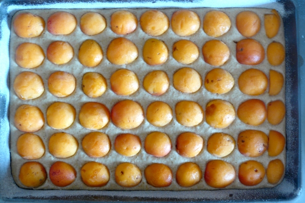 - Směs vylijte do předem vymazaného a vysypaného plechu a nahoru poklaďte zvolené ovoce, v našem případě meruňky.