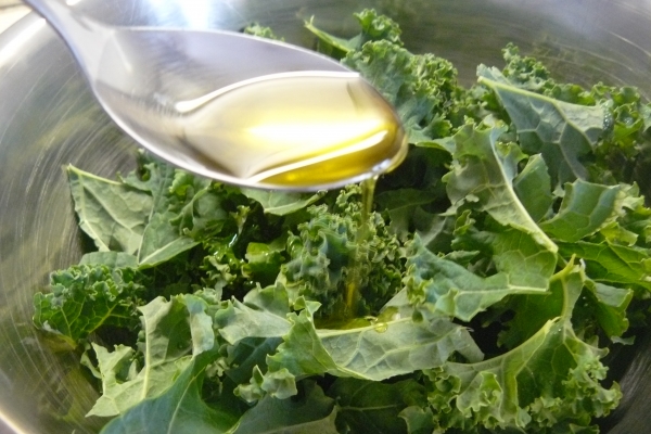 - Přidejte sůl a za studena lisovaný olej a důkladně promasírujte prsty tak, aby listy změkly a změnily barvu na sytě zelenou.