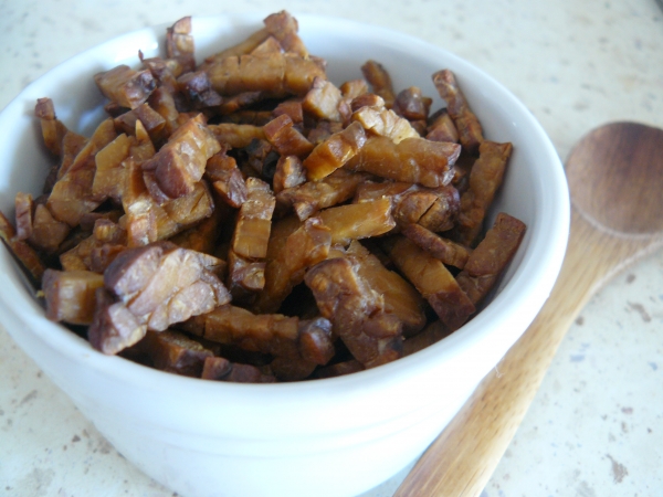 TIP č.1: Pokud chcete v tomto jídle navýšit množství bílkovin, orestujte na suché pánvi nadrobno pokrájený uzený tempeh. Ten buď přidejte během skládání na brambory, nebo jím posypte výsledné dílo až na talíři.
