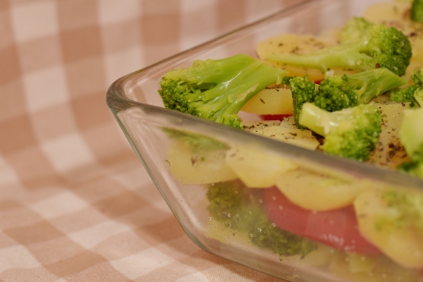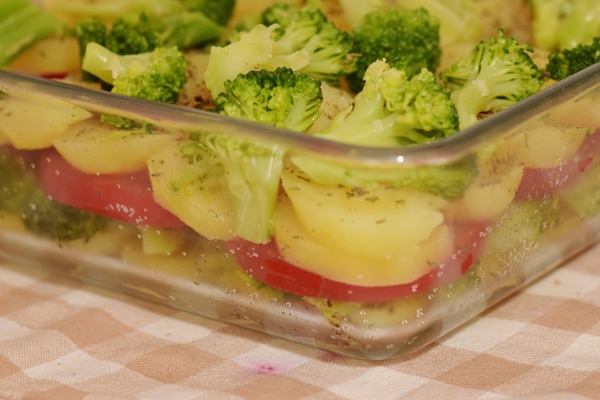 - Navrstvíme brokolici, na ni rajčata a poté brambory, které opět posolíme, opepříme, přidáme česnek a oregáno.